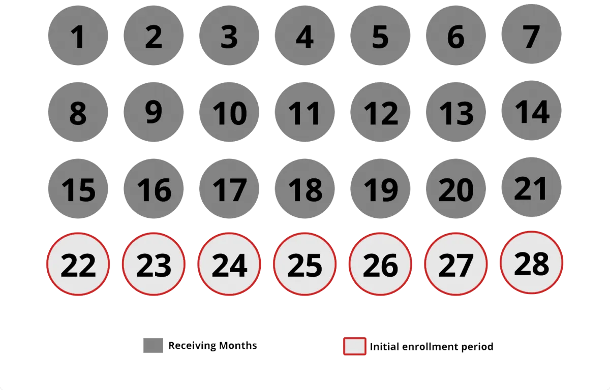 Your Initial Enrollment Period is determined by when you started receiving Social Security or Railroad Retirement Board (RRB) disability benefits. It begins in the 22nd month after you start receiving benefits and lasts until the 28th month after that.